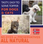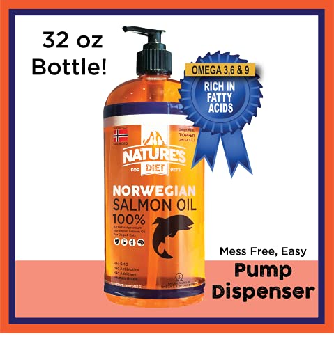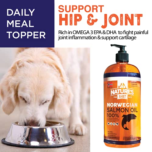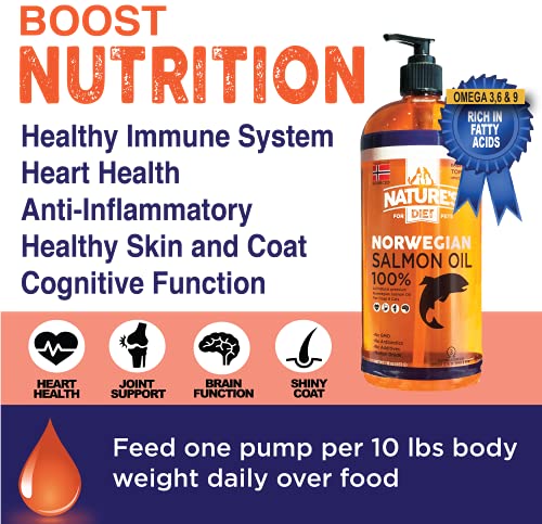 Details: Natureās Diet Norwegian Salmon Oil is 100% pure & naturally rich in OMEGA 3, 6 & 9. These powerful fatty acids work together to promote holistic health benefits ranging from heart and brain support, to hip & joint pain relief, digestive regularity and skin & coat health. At Natureās Diet, we source our ingredients thoughtfully to help your pet thrive. Our Salmon Oil is made with 100% Norwegian Salmon, raised sustainably in ocean environments off the south-western coast of Norway. Free of toxins commonly found in other products made with farm raised fish, our salmon oil gets its vibrant orange color naturally healthy fish. With no antibiotics, no harmful pesticides & no unnatural dyes from fish feed, Natureās Diet Salmon Oil is as delicious, nutritious and pure as it gets.